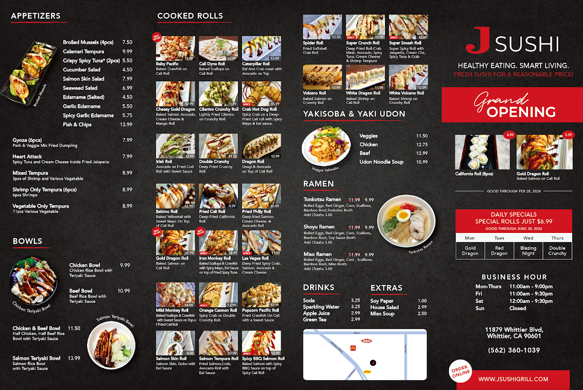 Welcome to J Sushi Whittier, a delightful sushi haven located at 11879 Whittier Blvd. This charming spot blends variety with creativity, serving up signature dishes that tantalize the taste buds. The menu features an exquisite array of options including broiled mussels and a savory salmon teriyaki bowl that embodies rich flavor. Don't miss their unique rolls such as the mild monkey roll with baked scallops and crawfish, or the playful crab hot dog roll—a spicy delight on a crispy California roll.